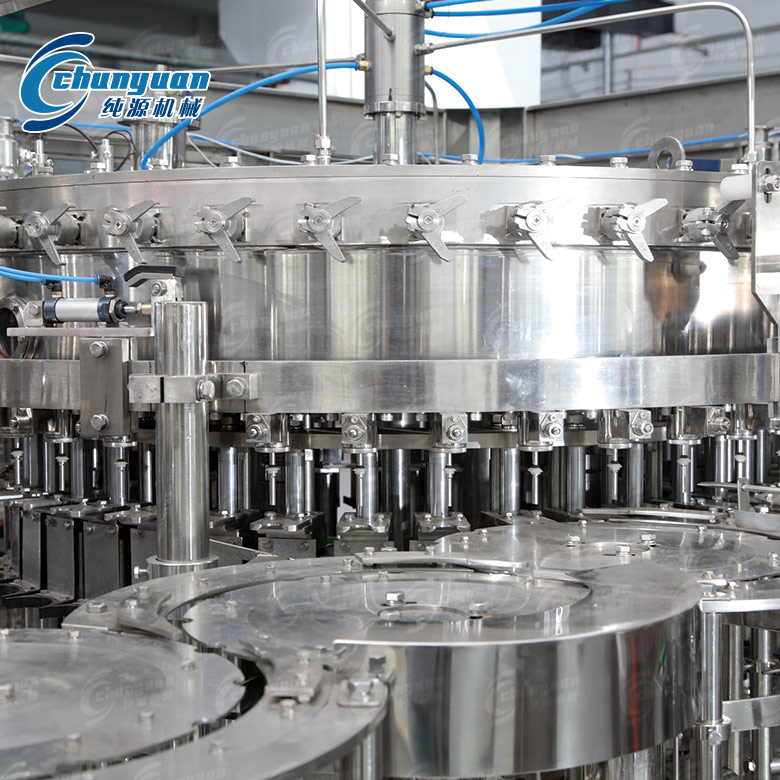 純源機械廠家供應的雪碧含汽飲料機械集沖洗、灌裝、旋蓋于一體,適用于灌裝雪碧、可樂、碳酸飲料、含汽蘇打水等含汽飲料的聚酯瓶灌裝,全過程實現自動化。