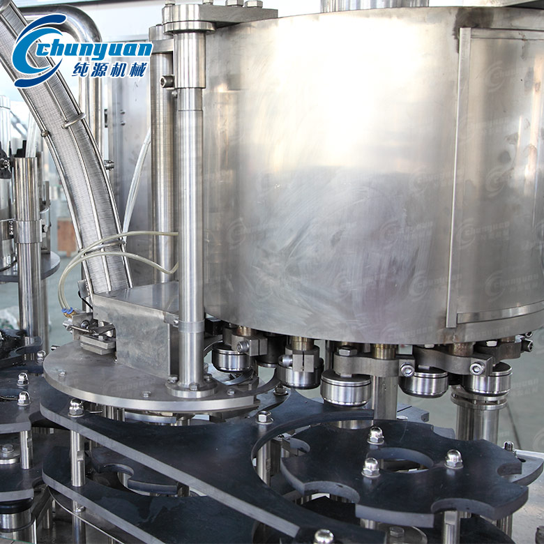 易拉罐椰子汁飲料機(jī)械采用常壓灌裝原理,當(dāng)空罐經(jīng)撥輪進(jìn)入升降托罐盤后,灌裝閥和空罐對中,空罐升起并密封,同時(shí)自動(dòng)打開灌裝閥的閥口,當(dāng)灌裝液面堵住閥的回氣管口時(shí)停止灌裝。灌好的罐子經(jīng)鉤子鏈送到封口機(jī)頭,蓋子經(jīng)送蓋器及壓頭把蓋子送到罐口上,當(dāng)托罐機(jī)構(gòu)升起時(shí),壓頭壓緊罐口,封口輪先預(yù)封再實(shí)封,罐子封好后被打蓋機(jī)構(gòu)的打頭推出,然后進(jìn)入出罐輸送。